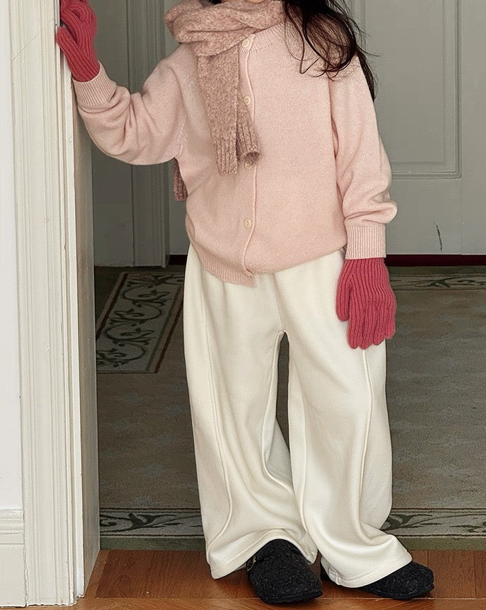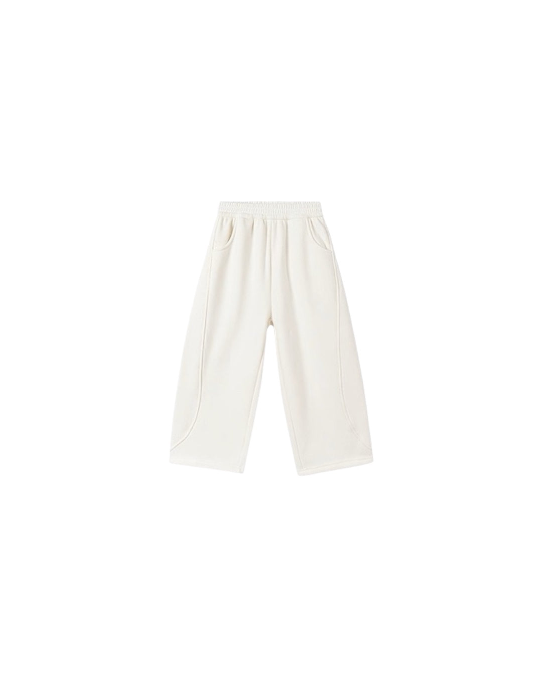 裏起毛のダブルフェイス素材で、見た目はクリーンに、肌当たりはあたたかく仕上げたワイドイージーパンツ。ウエストは総ゴム仕様で動きやすく、アイボリーの抜け感が冬のコーデを軽やかにまとめる。トップスを選ばずデイリーに活躍する。