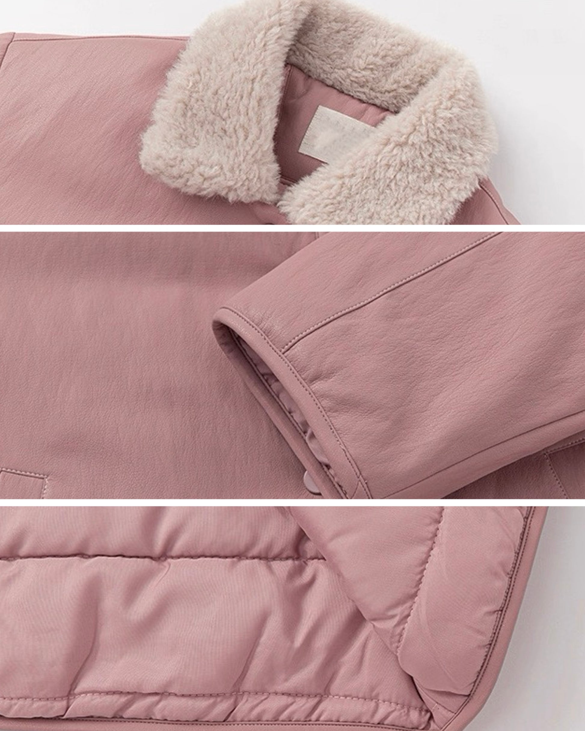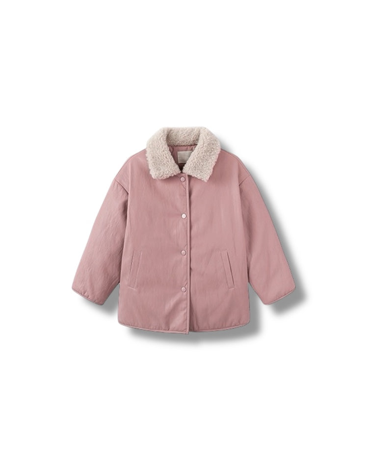 首元ボアデザインの中綿ジャケット。ピンクでもマットな質感のフェイクレザーで甘くならないのが海外らしいオシャレな印象に。