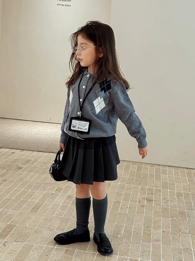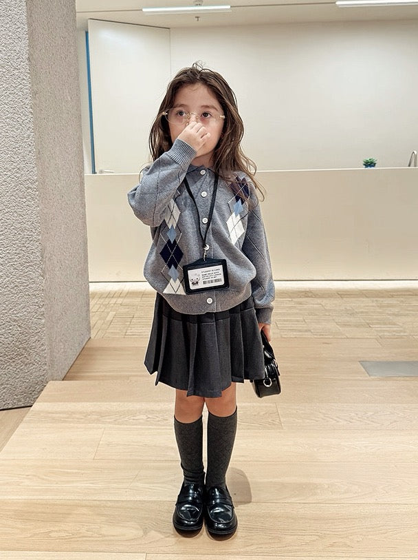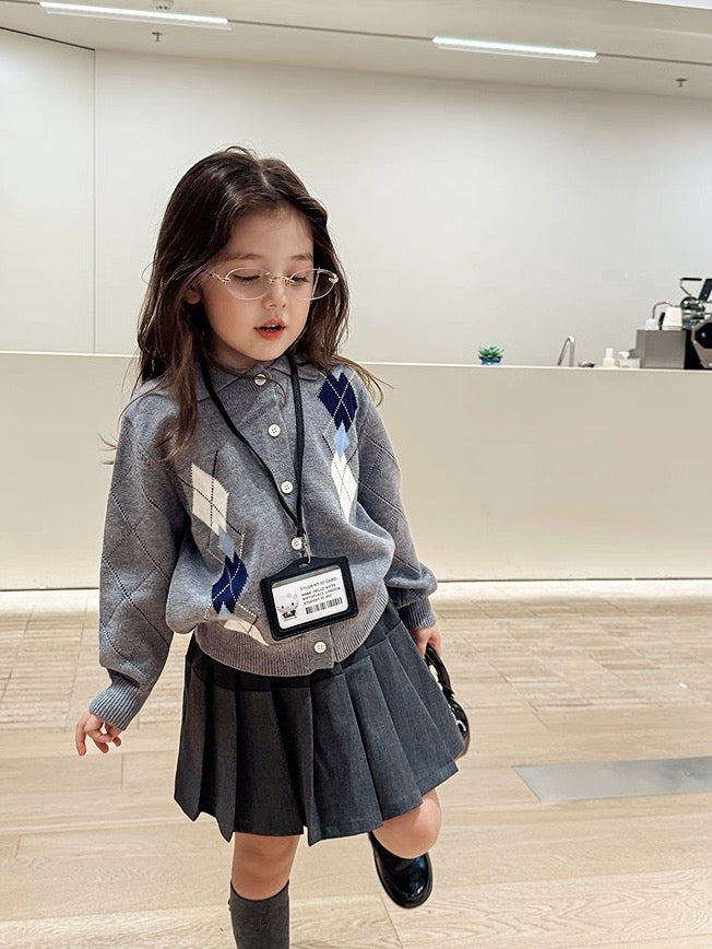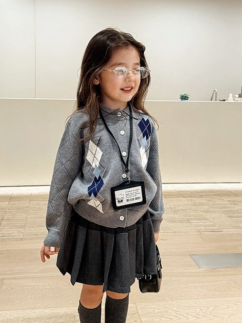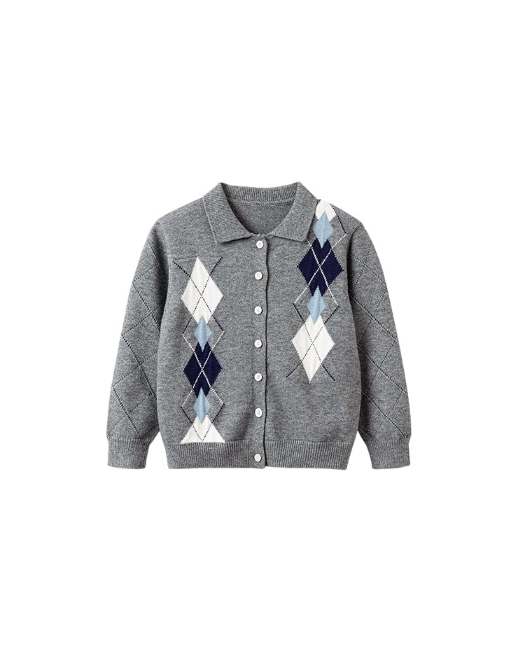 【100-160cm】襟付きアーガイル柄ニットカーディガン