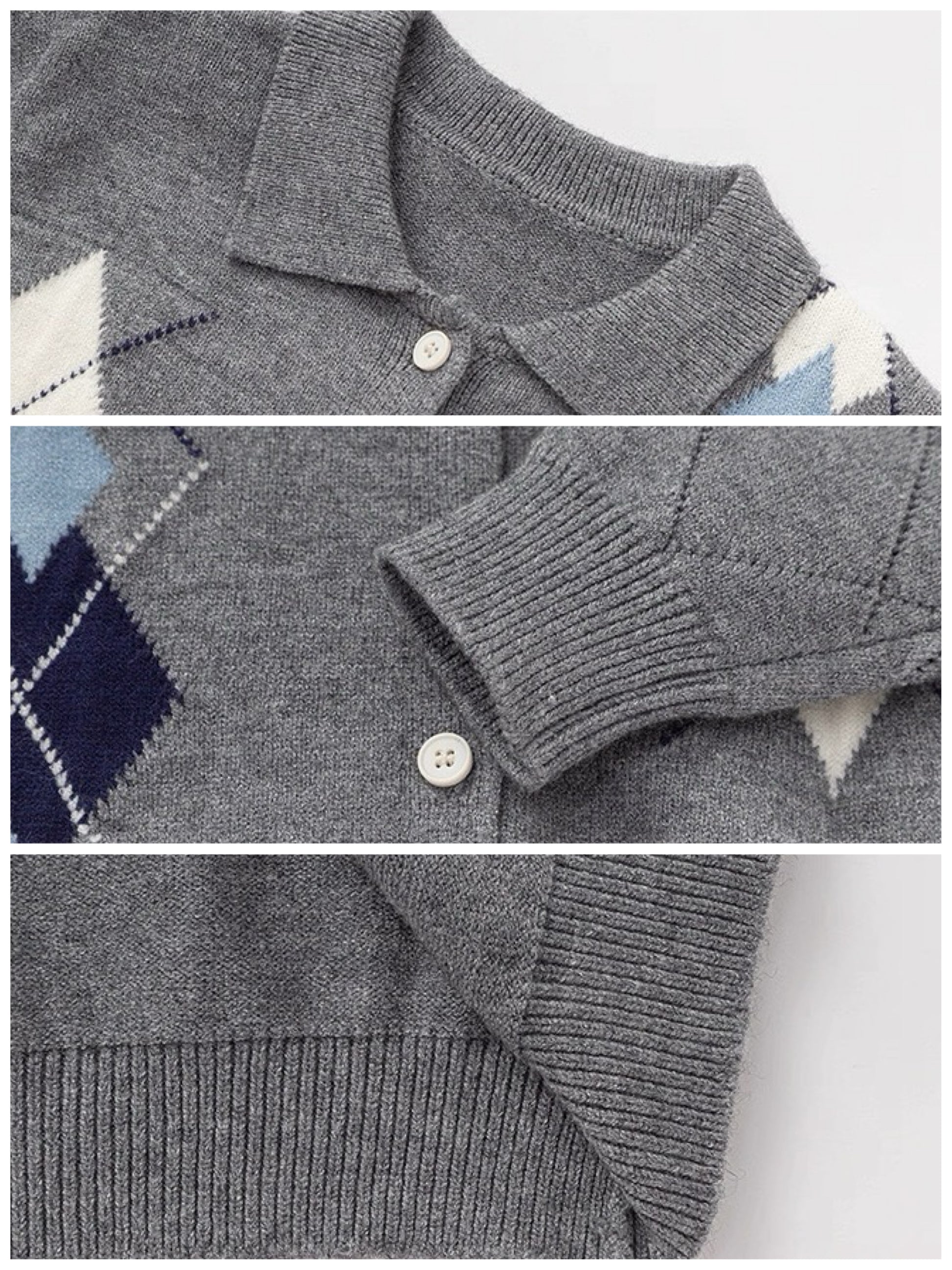 落ち着いたグレーベースにアーガイル柄をあしらったカーディガン。クラシックな雰囲気と柔らかい風合い。襟付きデザインなので上品な印象に仕上がる。