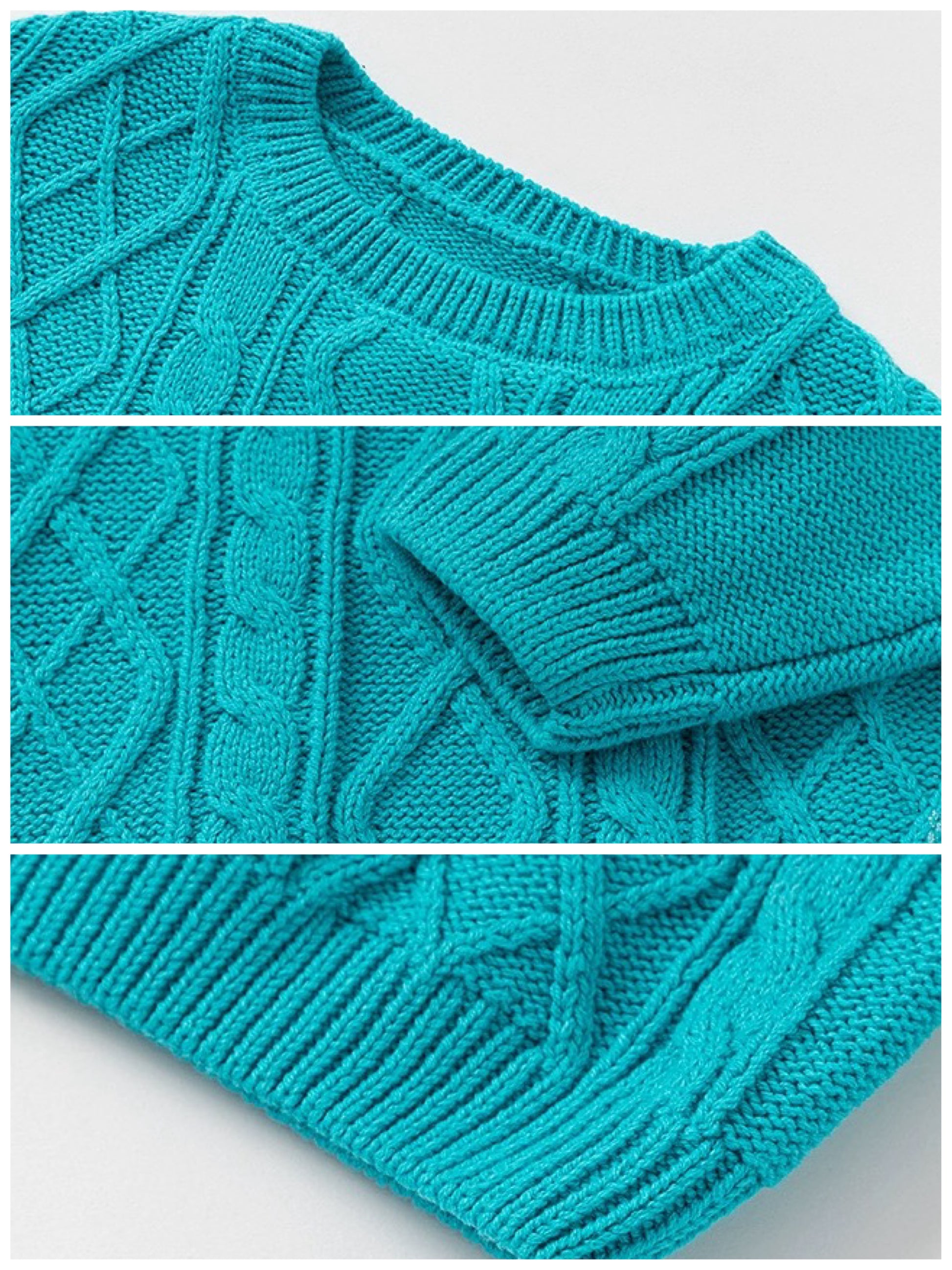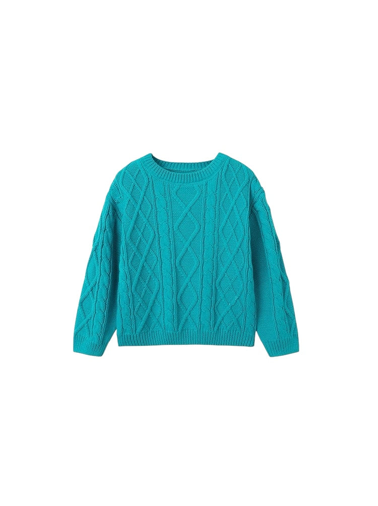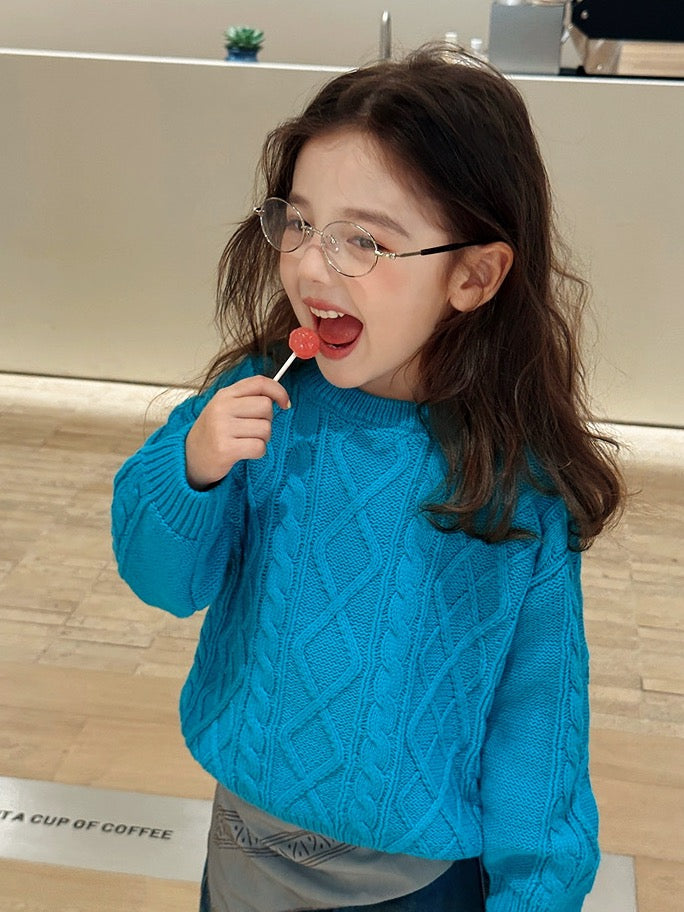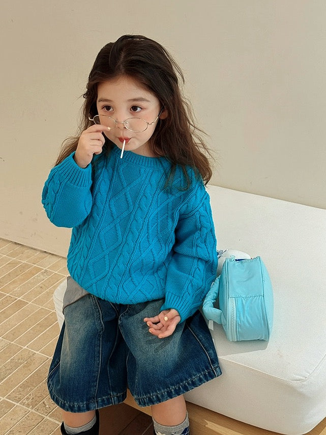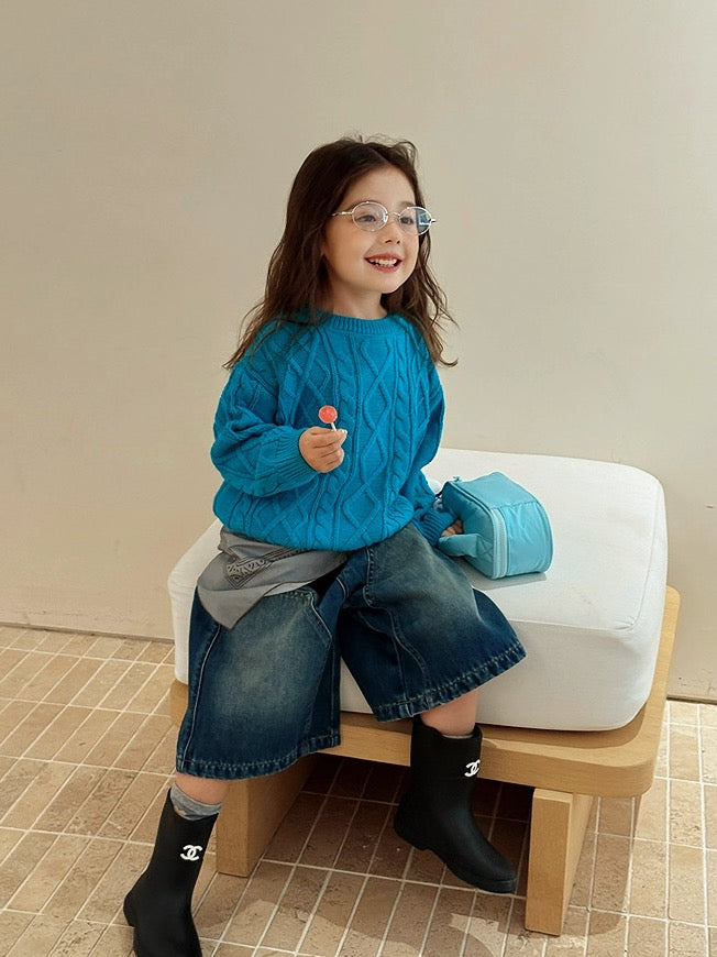 鮮やかなブルーが目を引くケーブルニットセーター。立体感のある編み模様が特徴で、シンプルながら存在感のある一枚。柔らかな肌触りで、秋冬のコーディネートにぴったり。