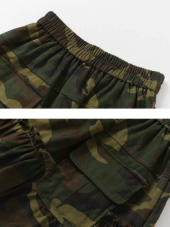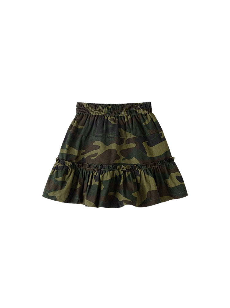 迷彩柄のフリルスカート。軽やかな素材感で、裾にフリルをあしらい女の子らしいシルエットに仕上げた一枚。ウエストはゴム仕様でフィット感があり、動きやすさと快適さを兼ね備えている。カジュアルにもストリートスタイルにも合わせやすい万能アイテム。