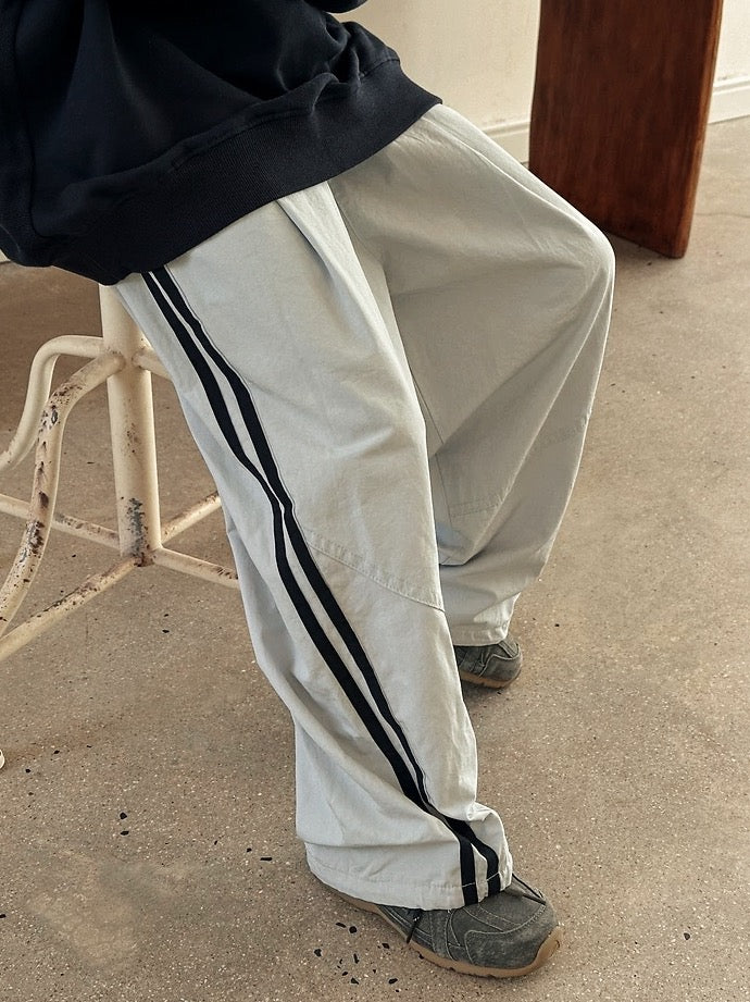 2本のサイドラインを施したロングパンツ。