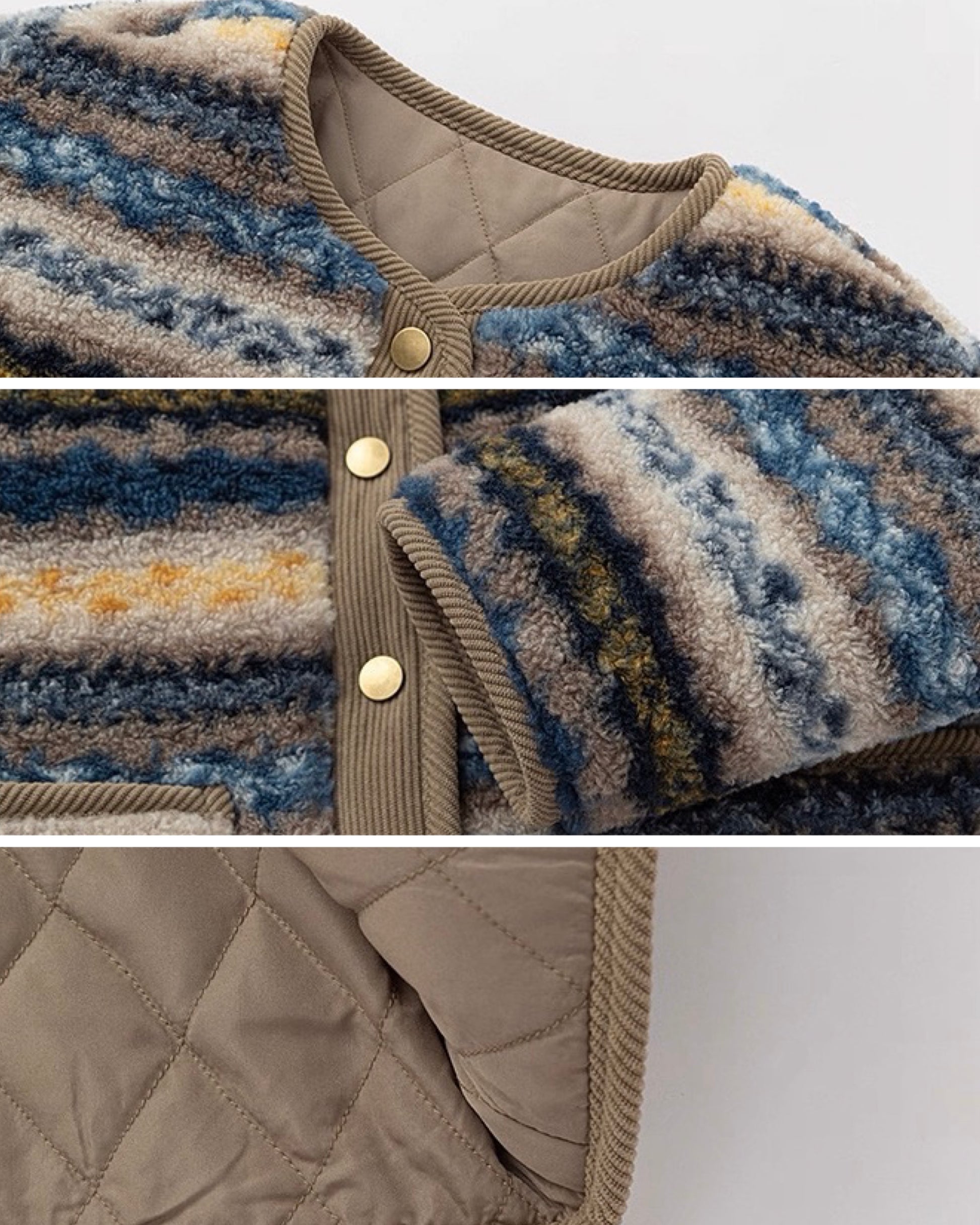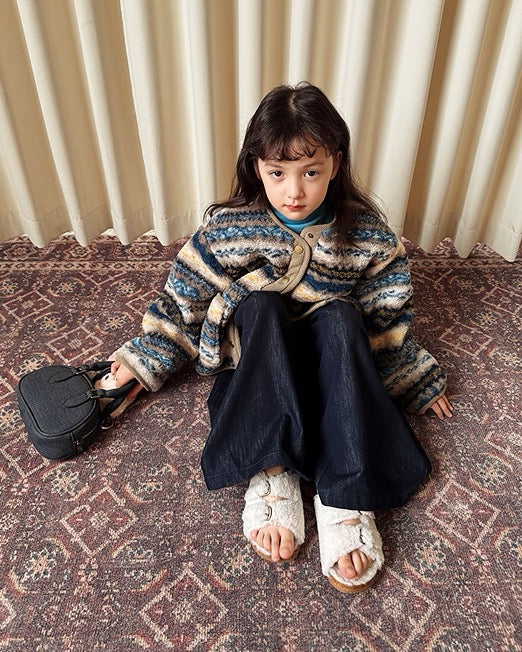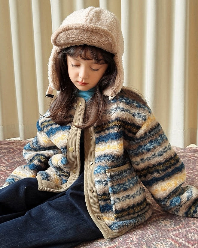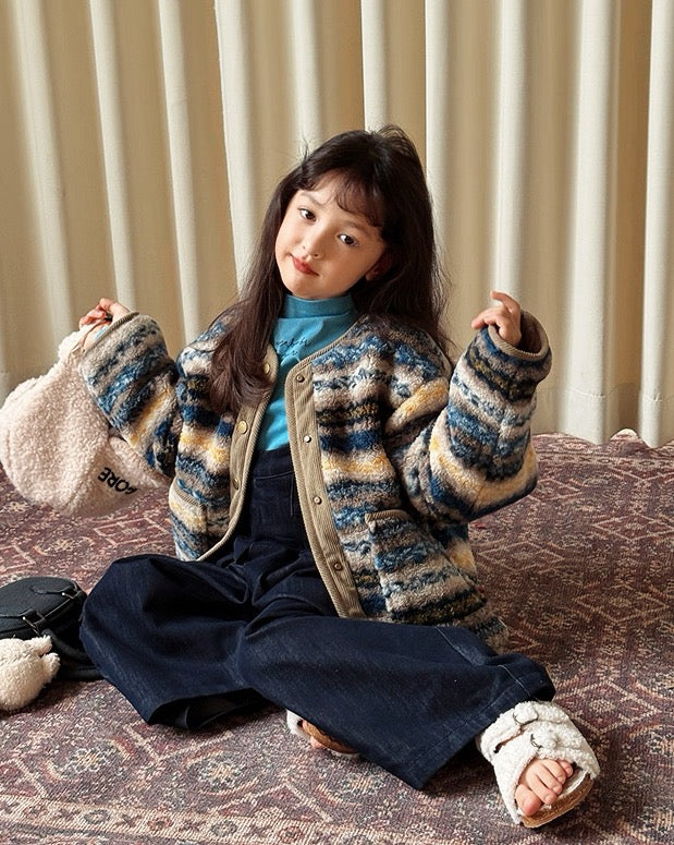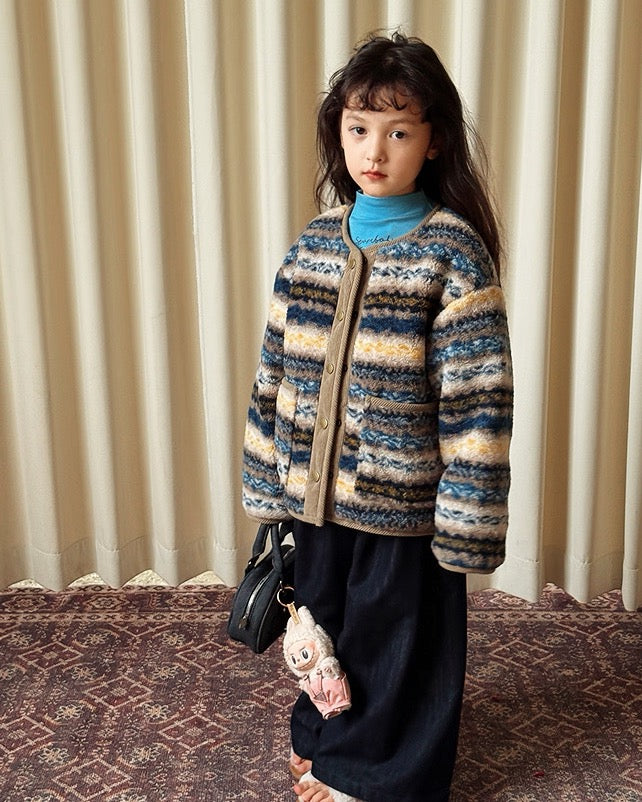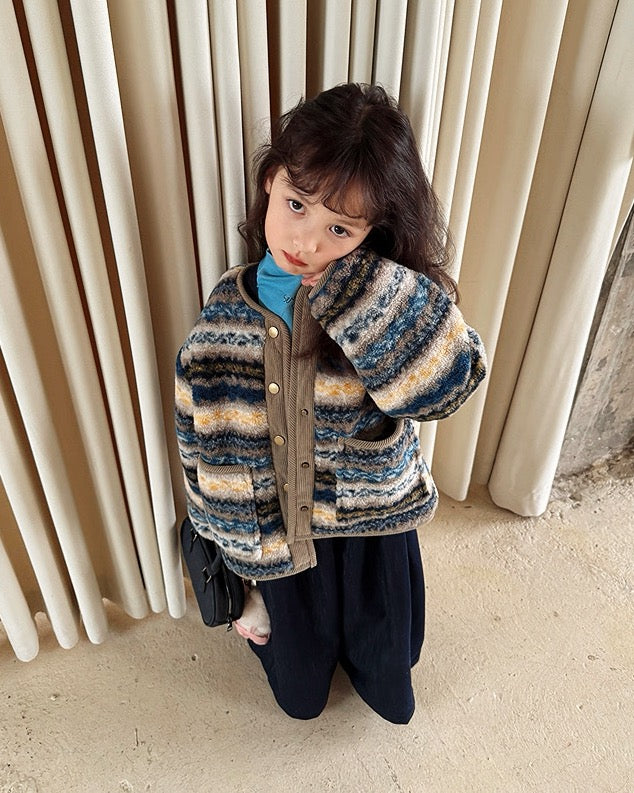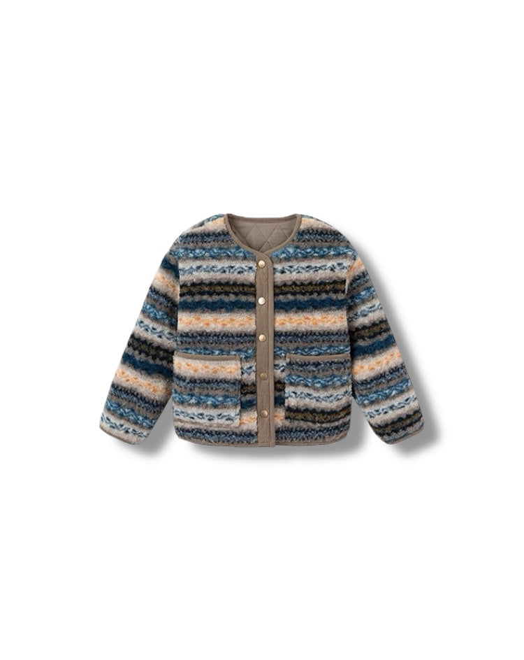 暖かみのあるボア素材で仕立てたノーカラージャケット。マルチカラーのストライプが上品なアクセントになるデザイン。軽量で柔らかな着心地ながら、しっかり防寒できる一着。