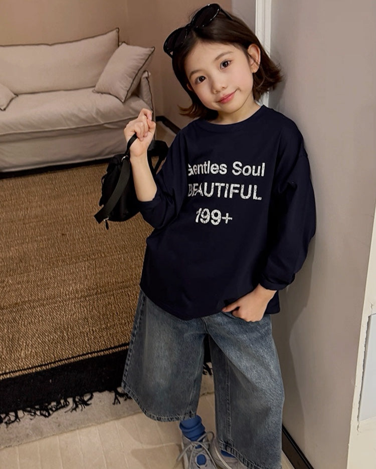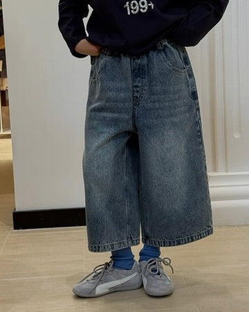 【110-160cm】キッズ ワイドクロップド デニムパンツ
