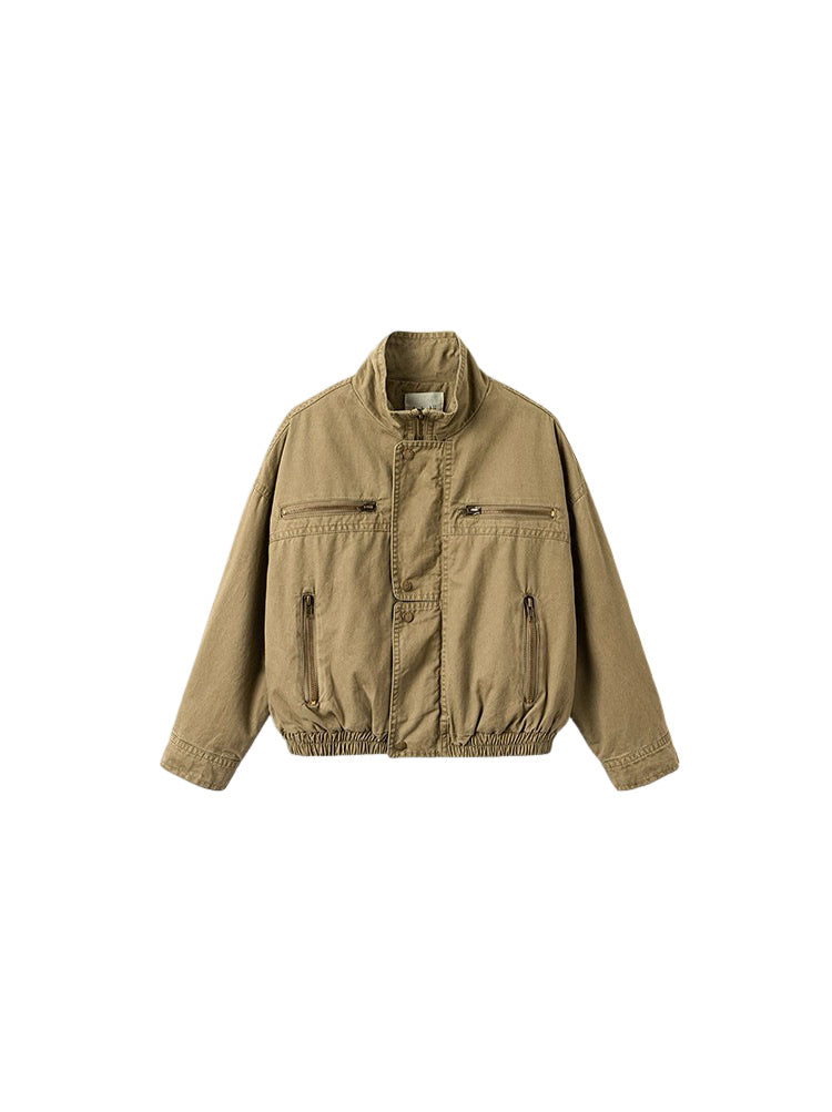 トレンド感のあるミリタリーテイストのスタンドカラージャケット。軽やかな素材ながらも程よいハリ感があり、立体的なシルエットを演出。ウエストと袖口はゴム仕様で動きやすく、デイリーユースからアウトドアまで幅広く活躍する一枚。